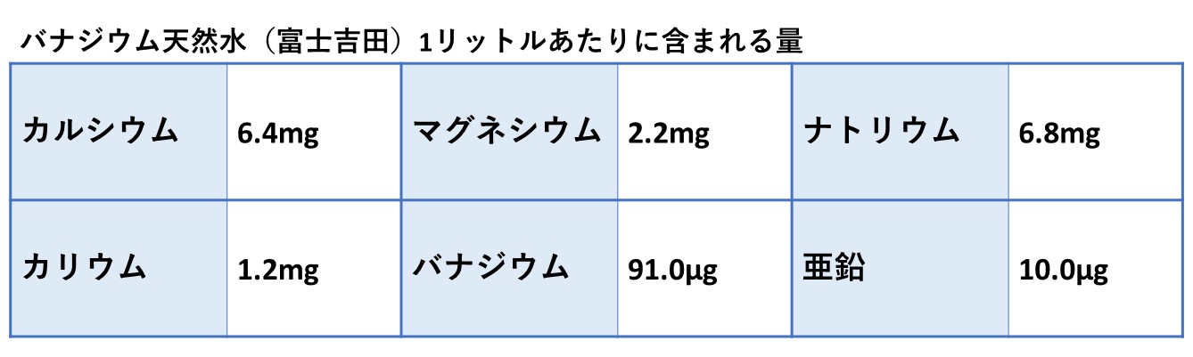 例として、デイリーウォーター by gooのバナジウム天然水(富士吉田)の成分表は以下となります。